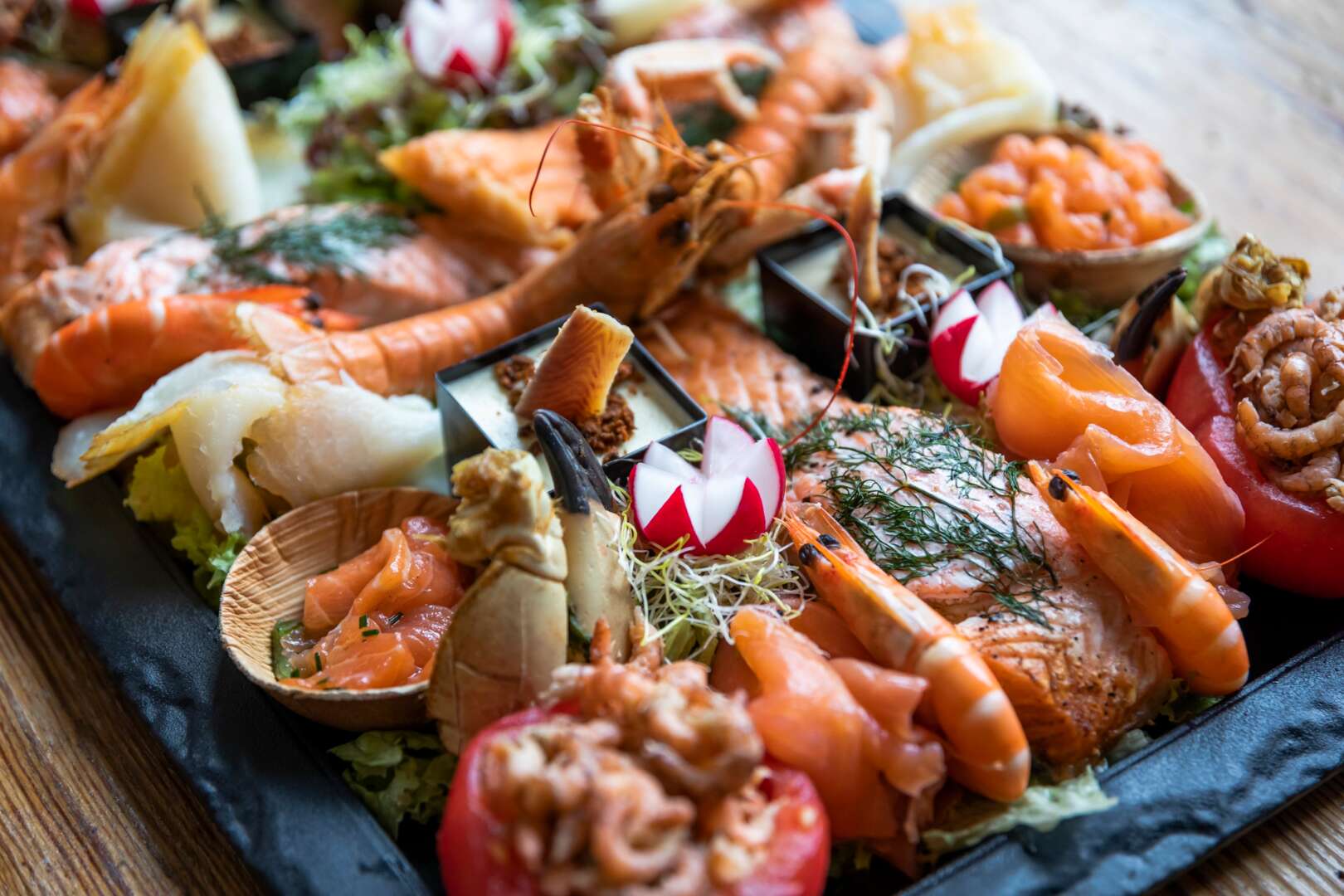 Een boeket van gerookte vissoorten, tomaat met handgepelde Noordzeegarnalen en een pallet van heerlijke zalm, heilbot, koningsgarnalen, langoustines,… afgewerkt met o.a. panna cotta van gerookte forel.